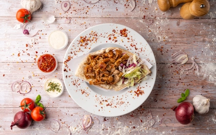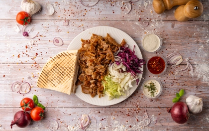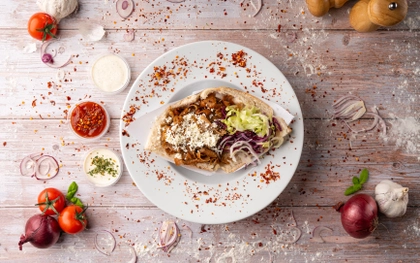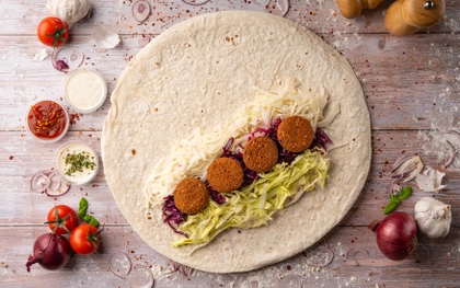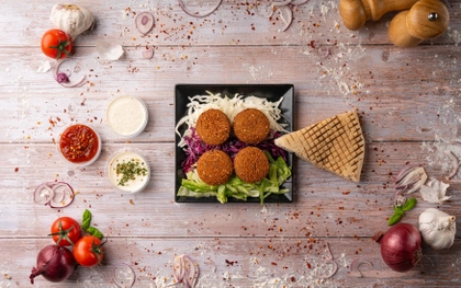 Fritované hráškové kuličky se salátem, omáčkou a tureckým chlebem