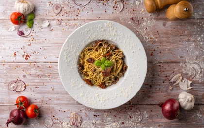 rajčatové sugo, mleté maso, česnek, oregáno, sýr parmezánového typu, červené víno, kořenová zelenina