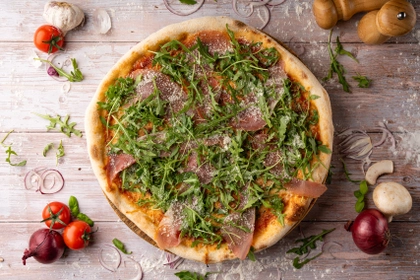 Tomat, mozzarella, sýr parmezánového typu, sušená italská šunka, rukola, bazalkové pesto, sušená rajčata