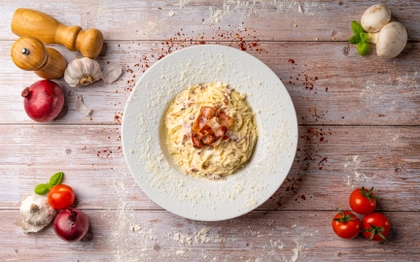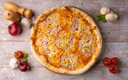 Smetana, mozzarella, anglická slanina, vepřová panenka, cibule, česnek