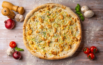 Smetana, mozzarella, kuřecí maso, niva, pórek, kukuřice