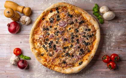 Tomat, smetana, mozzarella, tuňák, cibule, černé olivy