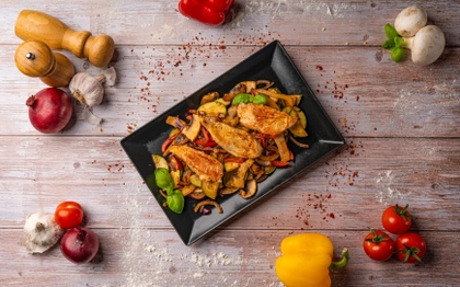 vepřová panenka, sušená rajčata, česnek, bazalkové pesto, sýr parmezánového typu