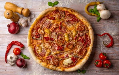 Tomat, mozzarella, paprikový salám, cibule, papričky jalapeño