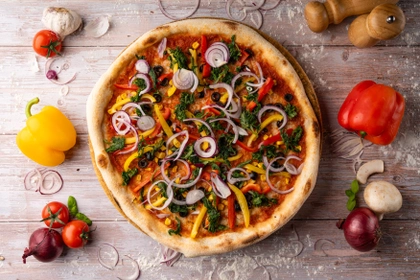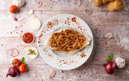 Tomat, mozzarella, trhané maso, červené zelí, cibule, papričky jalapeño, čedar