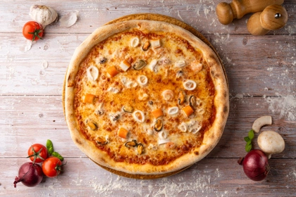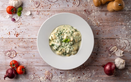 Tomat, smetana, mozzarella, mořské plody, bílé víno, česnek, máslo