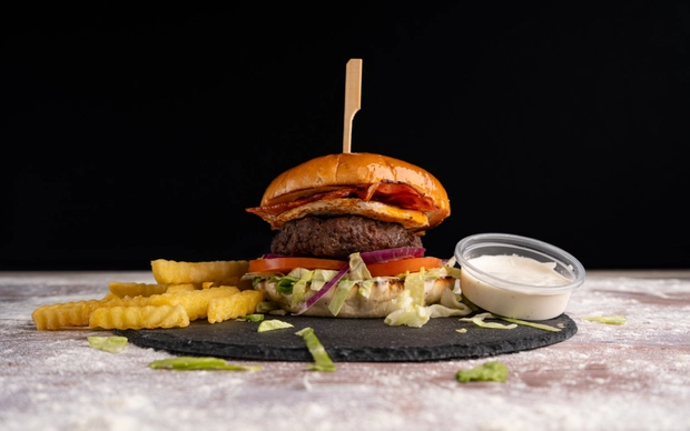 Chipotles burger z vyzrálého hovězího masa s dresinkem z kouřového aroma a chutney cibulkou, salát, slaninka, čedar, rajče