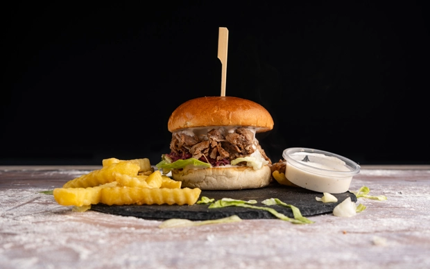 Chipotles burger z vyzrálého hovězího masa s dresinkem z kouřového aroma a chutney cibulkou, salát, slaninka, čedar, rajče