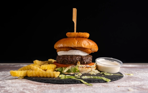 Chipotles burger z vyzrálého hovězího masa s dresinkem z kouřového aroma a chutney cibulkou, salát, slaninka, čedar, rajče
