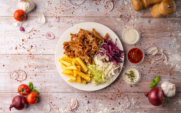 13. Velký talíř kebab s hranolky