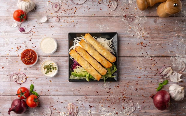 Fritované těsto plněné sýrem se salátem a omáčkou