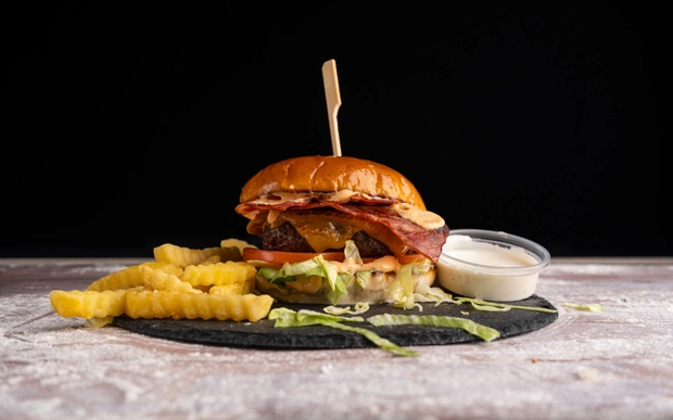 Chipotles burger z vyzrálého hovězího masa s dresinkem z kouřového aroma a chutney cibulkou, salát, slaninka, čedar, rajče