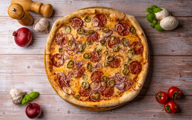 Tomat, mozzarella, paprikový salám, cibule, papričky jalapeño
