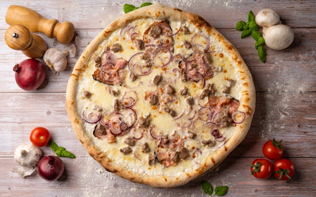 Smetana, mozzarella, anglická slanina, vepřová panenka, cibule, česnek