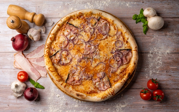 Tomat, mozzarella, slanina, cibule