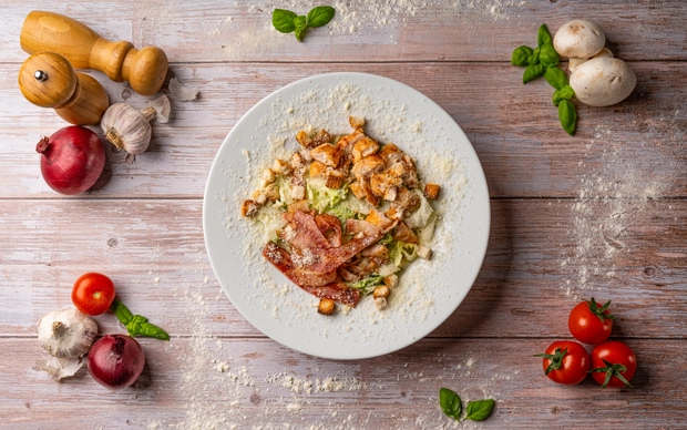 Listy salátu, ančovičkový dresink, anglická slanina, kuřecí prso, krutony, sýr parmezánového typu