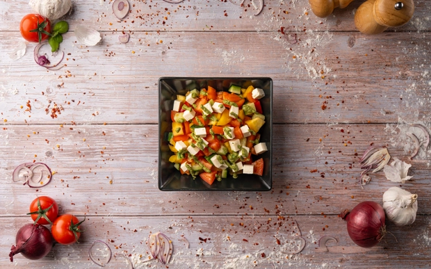Okurky, rajčata, papriky, balkánský sýr, bazalkové pesto